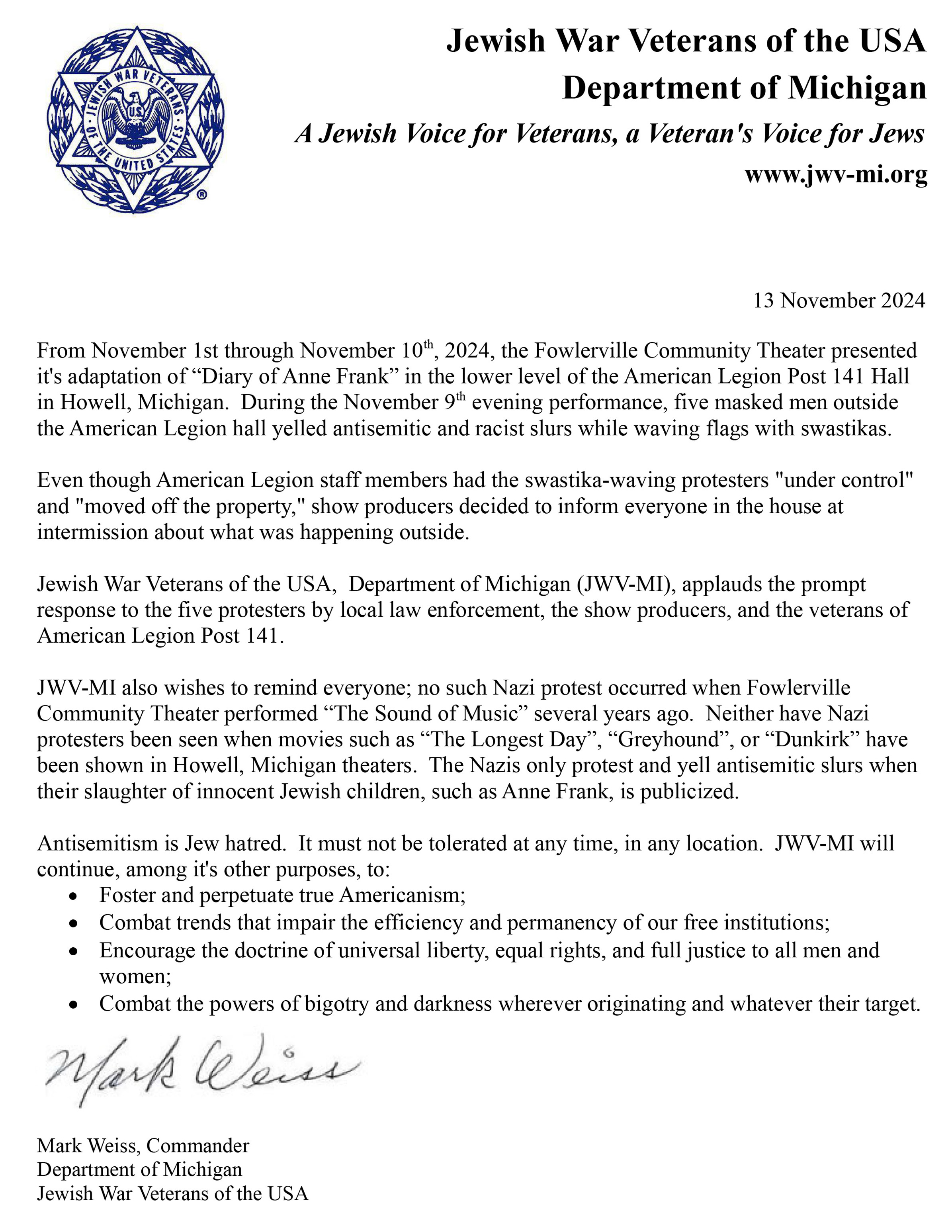 A press release (13 November 2024) from Department of Michigan Commander Mark Weiss about Nazis protesting outside "Diary of Anne Frank":