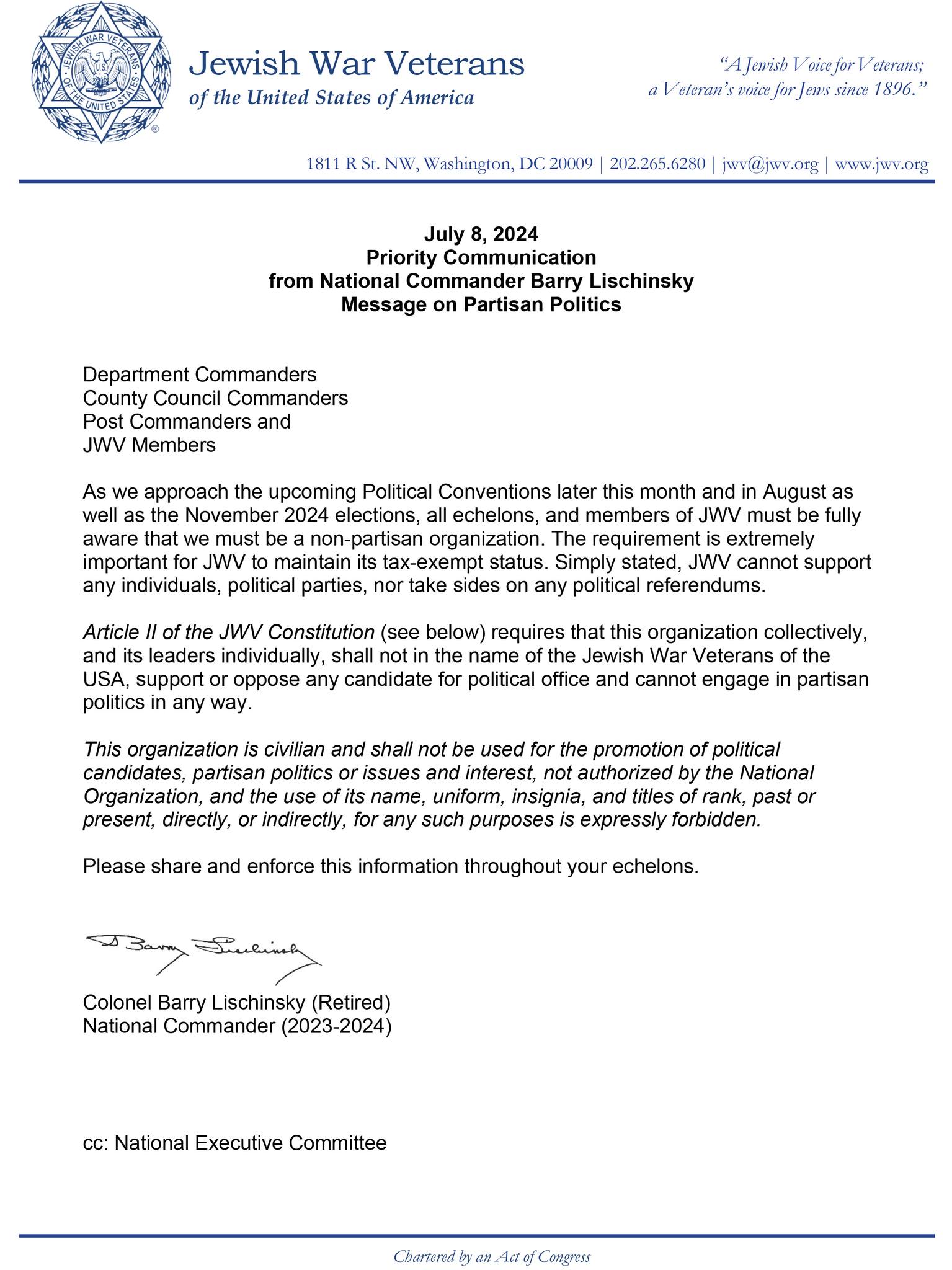 An important message (8 July 2024) from our National Commander about JWV and Politics: