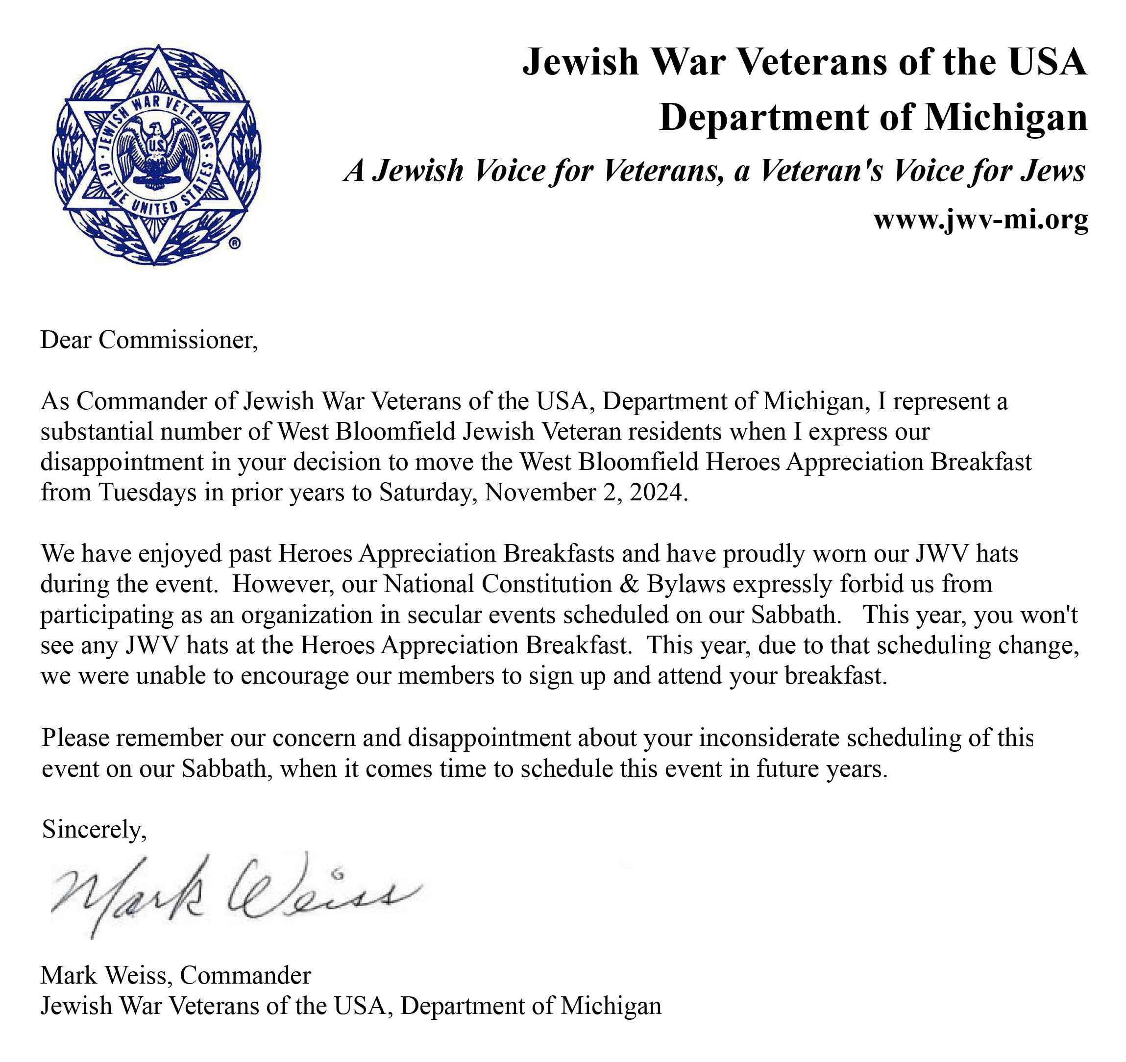 A letter (27 October 2024) from Department of Michigan Commander Mark Weiss to West Bloomfield Parks & Rec Commisioners